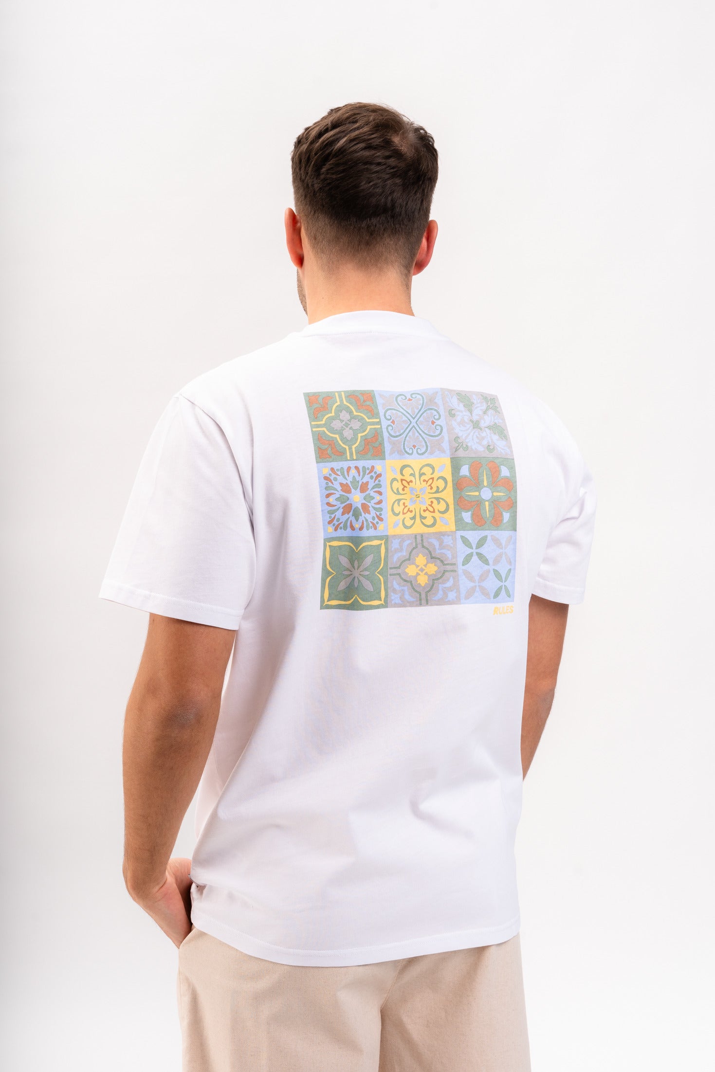 Der kunstvolle Backprint macht das Mento Tee von Rules zu einem absoluten Hingucker und und verleiht deinem Sommeroutfit eine einzigartige Note.