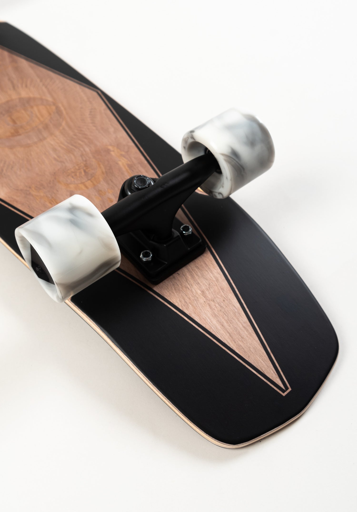 Das Deck an sich ist Designtechnisch grandios. Neben der gelaserten Eye Grafik macht es mit kleinen Details im Griptape auf sich aufmerksam. Die schwarz weißen Swirl Rollen mit dem Eye-Print legen nochmal eine Schippe drauf.