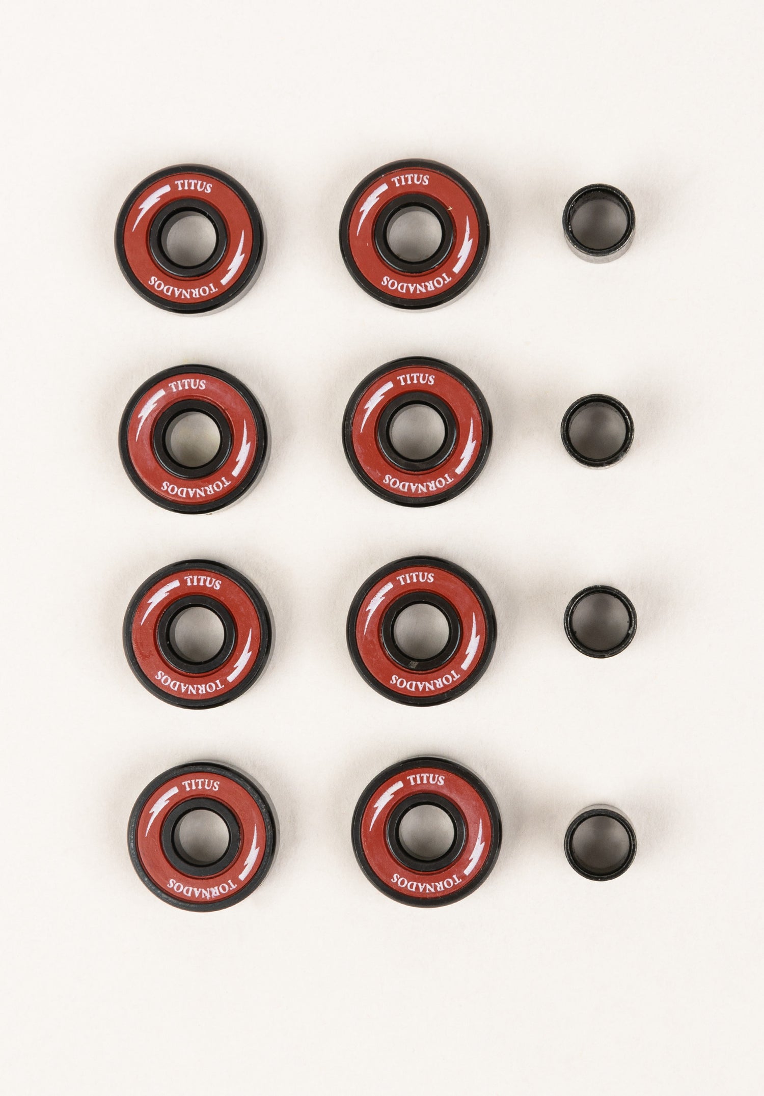 Unsere hauseigenen Skateboard Bearings überzeugen mit exzellenter Fertigungs- und Materialqualität. Die aus High-grade GCR 15 Chromstahl gefertigten Kugeln sind für einen perfekten Lauf sauber in High-speed Nylon Haltern geführt. Auch die Außenringe sind aus demselben soliden Chromstahl gefertigt, was die Titus Tornados Kugellager ausgesprochen widerstandsfähig macht. Ein erweiterter Korrosionsschutz bewahrt zusätzlich vor Verschleiß. Die vier mitgelieferten Spacer bringen deine Kugellager perfekt in Position und schützen vor Beschädigungen bei der Montage.