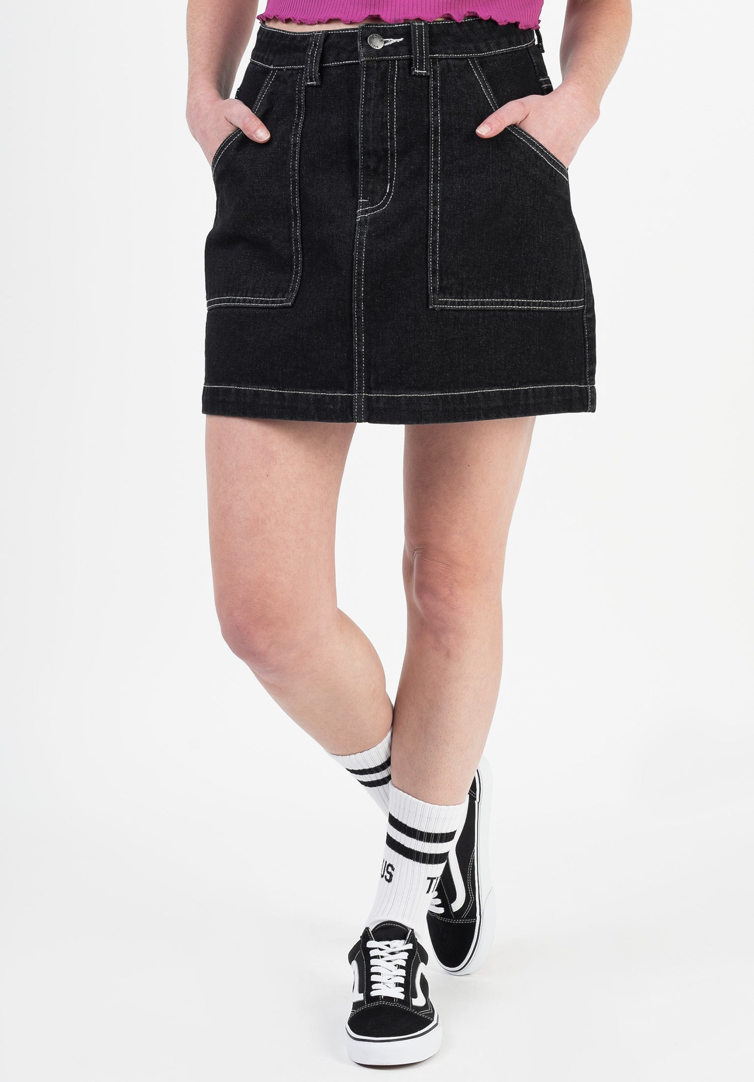 Der kurz geschnittene TITUS Alva Jeansrock bringt zwei aufgesetzte Frontpockets, Gürtelschlaufen und farblich abgesetzte Kontrastnähte mit. Bester Sommer-Style, der dein Outfit garantiert nach vorne bringt!